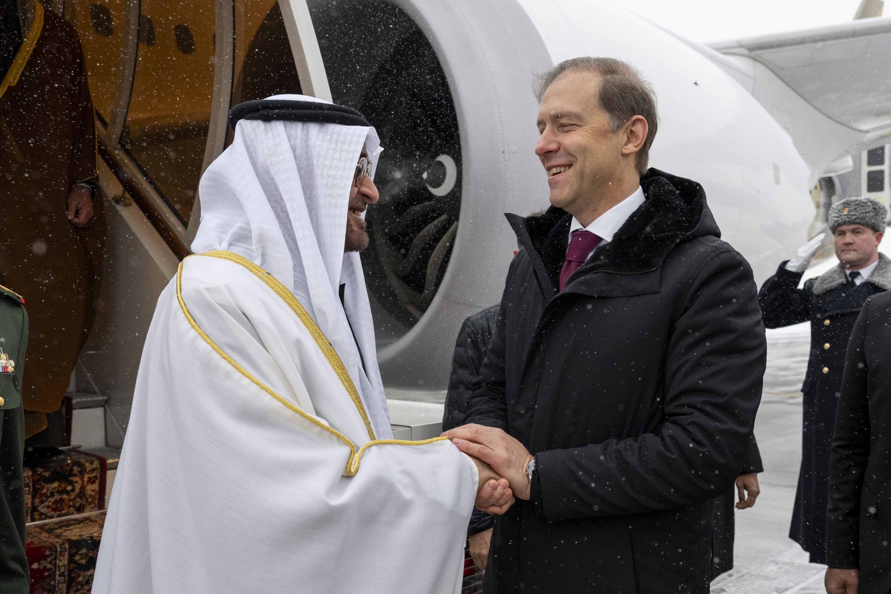 وصل صاحب السمو الشيخ محمد بن زايد آل نهيان رئيس الدولة "حفظه الله" اليوم إلى موسكو في زيارة رسمية إلى روسيا الاتحادية. ورافق طائرة سموه لدى دخولها الأجواء الروسية، سرب من الطائرات العسكرية تحية وترحيباً بسموه. ويضم الوفد المرافق لصاحب السمو رئيس الدولة خلال الزيارة: سمو الشيخ حامد بن زايد آل نهيان العضو المنتدب لمجلس إدارة جهاز أبوظبي للاستثمار، وسمو الشيخ حمدان بن محمد بن زايد آل نهيان نائب رئيس ديوان الرئاسة للشؤون الخاصة، والشيخ.